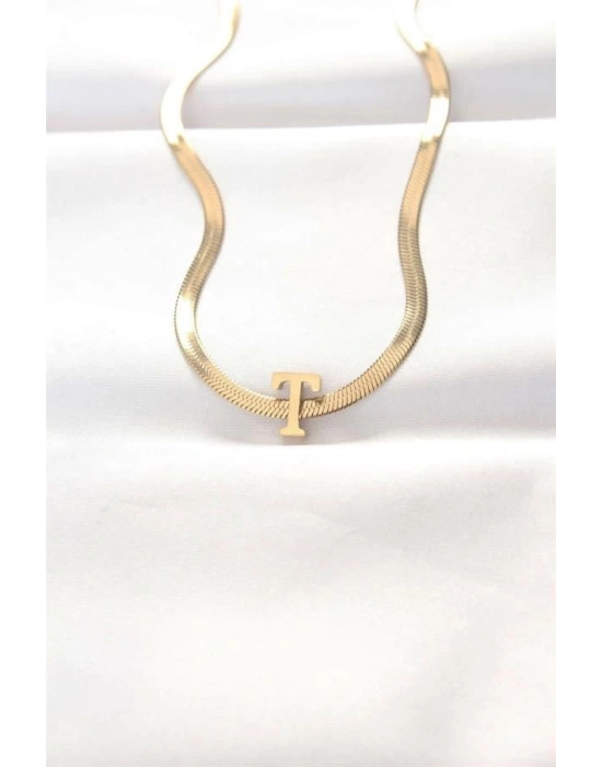 316L Çelik T Harfli Gold Renk İtalyan Zincirli Kolye